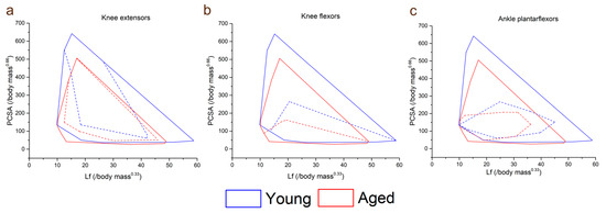 Total lower limb muscle functional morphospace (solid lines) compared to that of the knee extensors (a), knee flexors (b) and ankle plantarflexors (c) (dashed lines) in the young and aged populations. Here, muscles can be classed as force specialised (high PCSA, low fibre length), displacement specialised (high fibre length, low PCSA) or power specialised (high PCSA, high fibre length). In the aged population, the total functional morphospace is smaller and characterised by lower PCSAs and fibre lengths. However, the knee extensors take up a larger proportion of the entire lower limb muscle functional morphospace in the aged population than in the young population, suggesting a lack of functional specialisation in these muscles with increasing age. The shapes and relative sizes of the knee flexor and ankle plantarflexor muscles are similar between the age groups.
