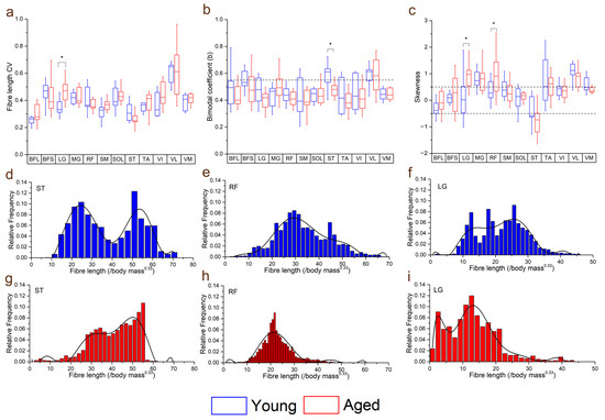 Differences in the coefficients of variation (CV: averaged over each muscle within each functional group) (a), bimodal coefficient (b) and skewness (c) between the young and aged populations. Muscles with a bimodal coefficient >0.55 can be classed as having a bimodal distribution of fibre lengths. Muscles with skewness values ≥0.5 can be classed as positively skewed, and ≤−0.5 as negatively skewed. Representative fibre length distributions in the young (d–f) and aged (g–i) populations are also shown, where semitendinosus (ST) had, on average, a bimodal distribution in the young population, but not in the aged. Rectus femoris (RF) and lateral gastrocnemius (LG) were both positively skewed in the aged population, with a higher proportion of shorter fibres, while these distributions were less skewed in the young population. For muscle definitions, see Methods. * indicates statistically significant differences (p < 0.05). On each box, the central horizontal line indicates the median value and the bottom and top edges of the box indicate the 25th and 75th percentiles. Whiskers extend to the most extreme data points. Ninth-order polynomial functions were used to approximate the fibre length distributions of each muscle (d–i).