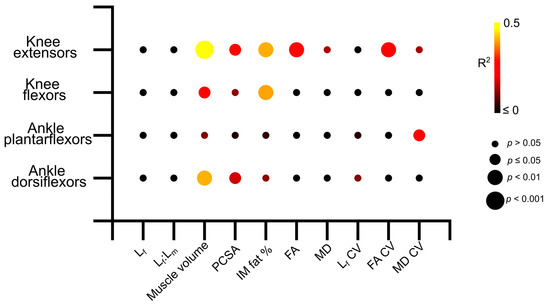 Matrix showing the R2 values and statistical significance of the linear relationships between log-normalised maximum isometric muscle torque and muscle architecture and microstructure averaged over each muscle within each functional group across the entire study population (aged and young participants). The knee extensors show stronger relationships between architecture and strength than other muscle groups. Lf—fibre length. Lf:Lm—fibre length muscle length ratio. PCSA—physiological cross-sectional area. IM fat %—intramuscular fat %. FA—fractional anisotropy. MD—mean diffusivity.