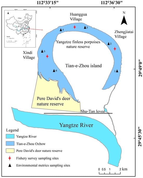 The Tian-e-Zhou Oxbow, located in the Yangtze River, serves as the first ex situ reserve established in China for the conservation of the Yangtze finless porpoise. In 1991, five Yangtze finless porpoises were introduced to the Tian-e-Zhou Oxbow from the Yangtze River, marking a crucial milestone []. Over the years, the population of Yangtze finless porpoises in the Tian-e-Zhou Oxbow has experienced significant growth, from more than 60 in 2015 to 101 in 2021 [,]; this makes the Tian-e-Zhou Oxbow the world’s first successful case of ex situ conservation for cetaceans. The Père David’s deer (Elaphurus davidianus) nature reserve was established in 1991 and is located adjacent to the Tian-e-Zhou Oxbow. Since the introduction of 64 Père David’s deer in 1993, the current population has exceeded 2500. Rising water levels in the Tian-e-Zhou Oxbow will reduce the size of the Père David’s deer nature reserve and may threaten the survival of the Père David’s deer, so the oxbow is often operated at a low water level, with only a small amount of Yangtze River water being allowed to reach the oxbow during the wet season []. Moreover, the construction of the Sha-Tan Levee has had a significant impact on the hydrology of the Tian-e-Zhou Oxbow, which has led to an increase of at least 0.5 m in the water level difference between the Yangtze River channel and Tian-e-Zhou Oxbow [], disrupting water exchange between the two ecosystems, which is detrimental to the protection and development of fish species and Yangtze finless porpoises in the Tian-e-Zhou Oxbow.