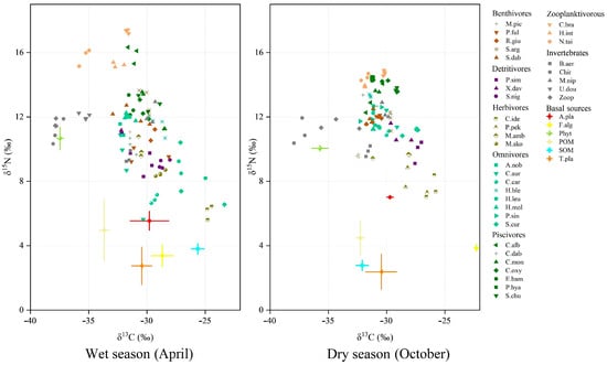 In this study, 203 consumers and 51 basal food source samples were collected in the Tian-e-Zhou Oxbow during the wet and dry seasons and analyzed for isotopic ratios of carbon and nitrogen. The consumers comprise 30 species of fish and 5 species of invertebrates, while the basal resources encompass 5 species of terrestrial plants and 3 species of aquatic plants, along with particulate organic matter (POM), sedimentary organic matter (SOM), and phytoplankton (Figure 3). Before the analyses, the data were checked for normality and homogeneity of variance assumptions, and logarithmic transformations were performed when needed by using SPSS 26. According to the dietary habits of the fish [], we divided the fish in the Tian-e-Zhou Oxbow of the Yangtze River into six categories: benthivores, detritivores, herbivores, omnivores, piscivores, and zooplanktivores. The stable isotope data relative to the consumer species (32 species in both the dry and wet seasons) fell within the isotopic mixing space determined by six potential sources in both seasons, indicating that the carbon sources tested were the most probable food sources for the consumers. The results of one-way ANOVA showed that the δ15N values of the piscivore and omnivore fish we collected were significantly higher in the wet season than in the dry season (p < 0.05), while no significant differences were found for δ13C values (p > 0.05). The δ13C values of zooplanktivore and detritivore fish were significantly lower in the wet than in the dry season (p < 0.05), while the δ15N values of the zooplanktivore fish were significantly higher in the wet than in the dry season (p < 0.05).