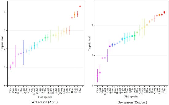 Trophic level distribution (Mean ± SD) characteristics of fish species in the Tian-e-Zhou Oxbow of Yangtze River. The different colors represent different species of fish. (See Figure 1 for abbreviations).