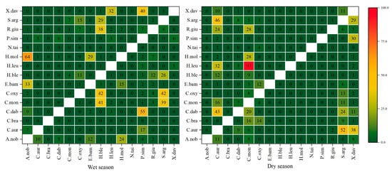 The proportion (%) of SEAc overlap between fish species in the Tian-e-Zhou Oxbow of the Yangtze River during the dry season and the wet season. Nutritional niche overlap contains two directions [,]; the number in the figure means the niche overlap percentage of longitudinal species to horizontal species.
