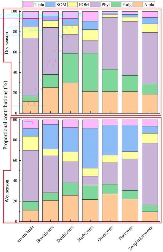 During the period of the wet season (Figure 6), the contribution of phytoplankton to invertebrates was the highest, accounting for 50.2%. Among the fish, zooplanktivore fish demonstrated the highest reliance on phytoplankton, with a contribution percentage of 60.5%. Herbivorous and omnivorous fish showed the highest contribution of SOM as a basal food source, with percentages of 39.4% and 29.6%, respectively. Overall, the contribution of the six food sources to the consumers in the Tian-e-Zhou Oxbow of the Yangtze River ranked as follows: phytoplankton > SOM > aquatic vascular plants > filamentous green algae > POM > terrestrial plants.