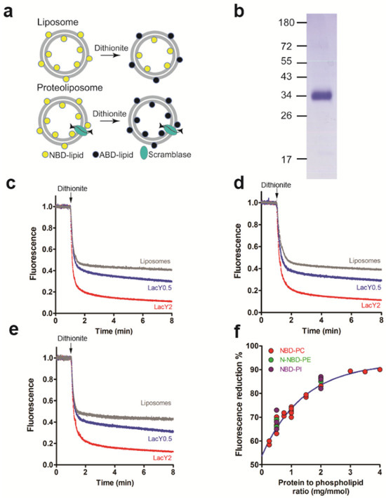 To study phospholipid scramblase activity, LacY was purified and reconstituted into liposomes consisting of ePC and E. coli polar lipid extract and containing trace amounts of fluorescent NBD-labelled glycerophospholipids as probes. This assay has been successfully used before to identify and characterize novel scramblases [18,30,31,32,33,34]. It measures the time course of fluorescence loss upon the addition of membrane-impermeant dithionite, reaching a 50% reduction in protein-free liposomes and higher values in proteoliposomes containing scramblase activity [28,29] (Figure 1a).