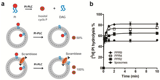 In addition to using NBD-labeled glycerophospholipids as probes, we also measured LacY-mediated scrambling of the natural 3H-labeled glycerophospholipid, [3H]PI, using PI-PLC as a probe [28] (Figure 2a). This method has been used before to determine the bilayer organization of PI and derivatives and to characterize novel scramblases [15,28,35,36,37]. Our results show that PI-PLC treatment of [3H]PI-containing proteoliposomes reconstituted with LacY at PPRs of 2, 4 and 9 mg/mmol resulted in ~62%, ~75% and ~82% hydrolyses, respectively, compared to ~50% hydrolysis in protein-free liposomes (Figure 2b). Taken together, our results demonstrate that purified LacY reconstituted into liposomes mediates the scrambling of NBD-labeled and natural glycerophospholipids across a membrane.