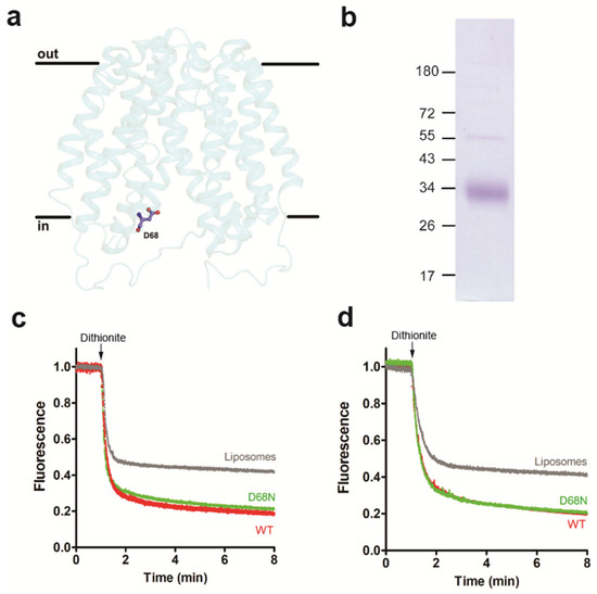 Inward-facing conformation of LacY retains scramblase activity. (a) Side view of the structure of LacY mutant D68N. (b) Coomassie-stained SDS-PAGE gel of purified LacY mutant D68N. Molecular mass markers are indicated in kDa. (c,d) Glycerophospholipid scramblase activity of LacY mutant D68N. Liposomes containing trace amounts of NBD-PC (c) or N-NBD-PE (d) were reconstituted with wild-type LacY (red traces) or LacY mutant D68N (green traces) using a PPR of 1 mg/mmol or mock-reconstituted (grey trace). Dithionite was added after 1 min, and fluorescence was recorded continuously for 8 min. All traces represent mean values from at least three independent experiments.