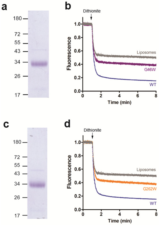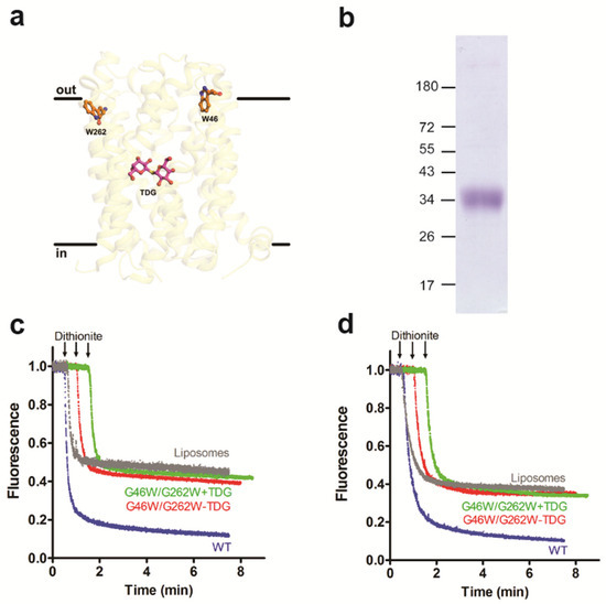 It is well established that certain mutants of LacY show altered protein conformations. To study if changes in the protein conformation may affect LacY glycerophospholipid scrambling activity, we first generated the LacY mutant D68N, in which the protein is locked in a cavity-inward-facing conformation [38] (Figure 4a). After expression and purification of the mutant protein (Figure 4b and Figure S2), it was reconstituted into liposomes and analyzed for glycerophospholipid scramblase activity using NBD-PC and NBD-PE as probes. The results shown in Figure 4c,d reveal that the D68N mutant had identical scramblase activity as wild-type LacY. Second, we studied the LacY double mutant G46W/G262W, which has been shown to lock into a partially open outward-facing conformation when crystallized in the presence of β-D-galactopyranosyl-1-thio-β-D-galactopyranoside (TDG), with the cytoplasmic side being tightly sealed [39] (Figure 5a). The opening on the periplasmic side is too narrow to allow the entrance or exit of sugar substrates; however, the double mutant is able to bind sugar substrates and initiate the transition but cannot complete it into an occluded state as the bulky Trp residues at positions 46 and 262 block complete closure [20,39]. Unexpectedly, we found that when the purified LacY mutant G46W/G262W (Figure 5b and Figure S2) was reconstituted into proteoliposomes in the presence of 1 mM TDG at a PPR of 2 mg/mmol, scrambling of NBD-PC was drastically reduced, i.e., from 85% for wild-type LacY to 57% for LacY mutant G46W/G262W (Figure 5c). A similar result was obtained with N-NBD-PE as a probe to measure glycerophospholipid scrambling (Figure 5d). These results indicate that the locked outward-facing conformation, or the mutated amino acids, inhibit the scrambling of NBD-glycerophospholipids.