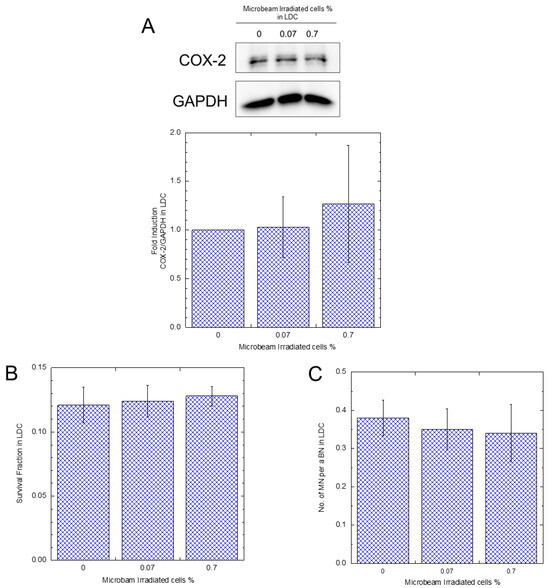A COX-2 protein expression, survival fraction, and micronuclei induction rate of A549-GFP LDC samples after with or without microbeam irradiation. A total of 500 protons were irradiated per position, and the number of positions corresponds to the percentage of irradiated cells. Twenty-four hours later, Western blotting revealed the COX-2 protein expression in the bystander cells (A). Regarding cell survival and micronuclei rate, cells were exposed to 4.4 Gy X-rays. Then, the 0.07% and 0.7% IR samples were compared against the non-microbeam-irradiated sample (0% IR) (B,C).