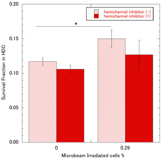 A survival fraction of A549-GFP HDC samples after 4.4 Gy X-ray exposure. A total of 500 protons were irradiated per position, and the number of positions corresponded to the percentage of irradiated cells. A549-GFP cells in HDC were incubated with a hemichannel inhibitor, 50 µM lanthanum chloride (solid bar), or sham (slant stripe bar). Twenty-four hours later, with or without microbeam-irradiated cells were X-ray irradiated, and the cell survival was detected using colony formation assay. * p-value < 0.05.