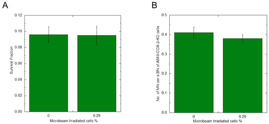 Overall, the only condition that showed radioresistance against X-ray exposure was HDC 0.29% IR. From Figure 3, Figure 4 and Figure 5, we hypothesized that COX-2 and PGE2 responses are involved in radioresistance in bystander cells. To test this hypothesis, we used A549-COX-2-KO cells in HDC 0.29% IR. Twenty-four hours after microbeam irradiation, whole HDC A549-COX-2-KO cell sample dishes were exposed to 4.4 Gy of X-rays. After that, cell survival was determined using the colony formation assay, and DNA damage was assessed using the MN assay. The data on cell survival and MN rates are presented in Figure 6A and B, respectively. Interestingly, we did not observe X-ray radioresistance in A549-COX-2-KO cell samples.