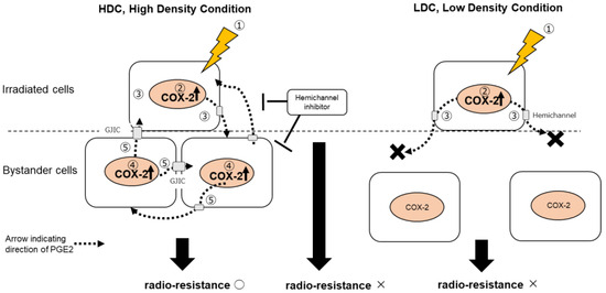 Schematic of the suggested model based on the main outcomes of this study. Responses occur in numerical order from 1 to 5. In microbeam-irradiated A549 cells (1), the expression of COX-2 protein (2) was induced and its metabolite PGE2 (3) was released into the extracellular environment. In HDC, bystander A549 cells were in close contact with each other, allowing PGE2 to act on neighboring bystander A549 cells and stimulate COX-2 expression (4). These COX-2-expressing cells continue to produce PGE2 (5), resulting in a feedback loop and amplification of the COX-2/PGE2 response within the cell population. Consequently, bystander A549 cells exhibit radioresistance. Hemichannels are involved as one of the propagation routes of PGE2, and inhibiting hemichannels diminished radioresistances. PGE2 may also be propagated through GJIC, which is composed of hemichannels. In LDC, in microbeam-irradiated A549 cells (1), COX-2 protein expression (2) was induced. However, the released PGE2 (3) cannot reach the surrounding bystander A549 cells and loses its activity. Thus, no propagation and amplification of the COX-2/PGE2 response were observed, and radioresistance was not induced in bystander A549 cells.