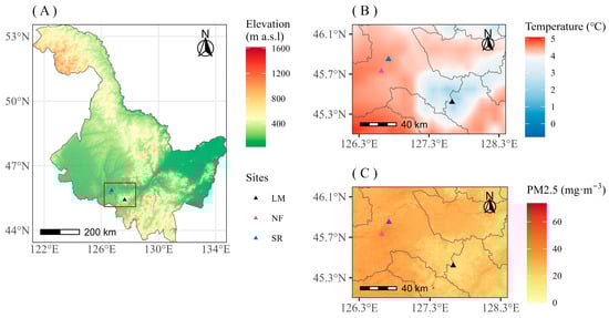 Three sample sites distributed in Heilongjiang province, Northeast China (A). NF (slightly polluted urban site)–Northeast Forestry University Urban Forestry Demonstration Base, Harbin, northeast China; SR (heavily polluted urban site)–Shuini Road, Harbin, Northeast China; LM (rural site)–Maoershan Forest Ecosystem National Field Scientific Observation and Research Station, Shangzhi, Northeast China. (B) Temperature differences among the three sampling sites (2015); (C) PM2.5 concentration differences among the three sampling sites (2001).