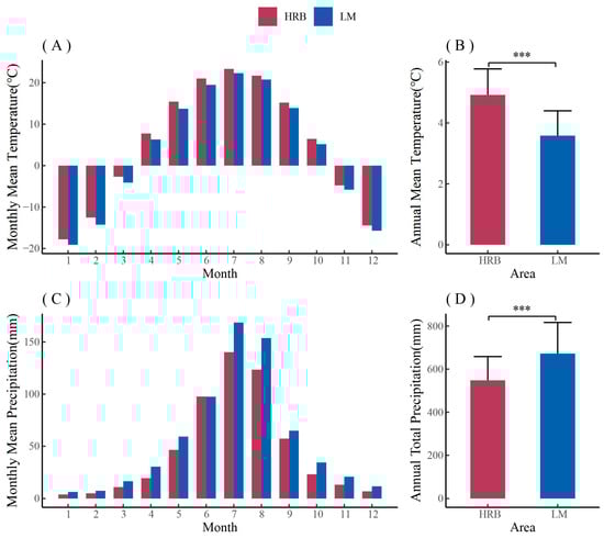 Comparisons of monthly mean temperature (A), annual mean temperature (B), monthly mean precipitation (C), and annual total precipitation (D) between urban (HRB) and rural (LM) (1951–2020). Standard deviation was shown with error bars. The significance values of the annual climate data are indicated. *** p < 0.001.