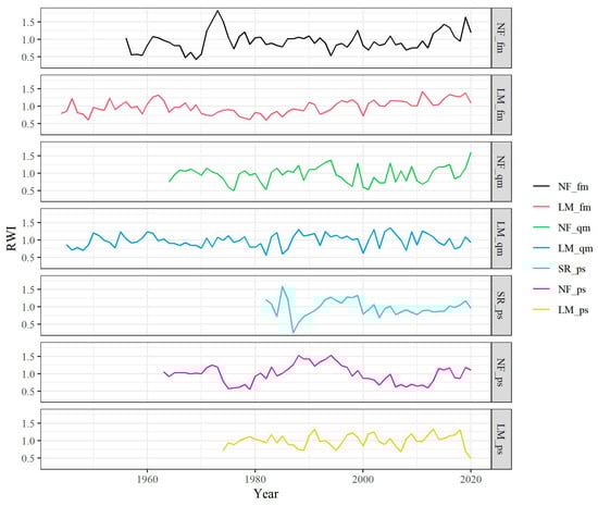 Tree-ring chronologies of F. mandshurica (fm), Q. mongolica (qm) and P. sylvestris var. mongolica (ps) xylem among urban (SR—heavy pollution, NF—light pollution) and rural (LM) sites.