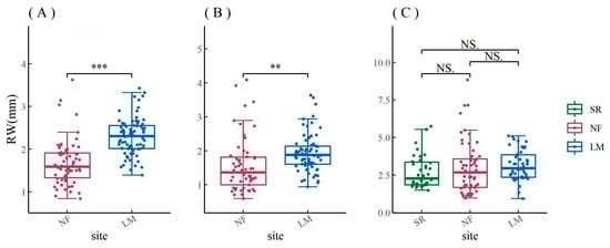 Comparison of the ring width of F. mandshurica (A), Q. mongolica (B), and P. sylvestris var. mongolica (C) among urban (SR—heavy pollution, NF—light pollution) and rural (LM) sites. The significance values of the ring width are indicated. NS. no significant difference; ** p < 0.01; *** p < 0.001.