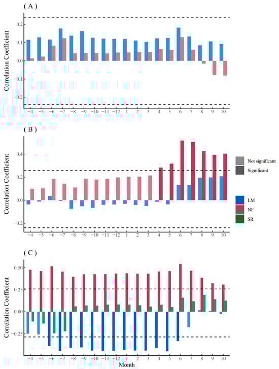 Correlation analysis between the tree-ring chronologies and monthly SPEI of F. mandshurica (A), Q. mongolica (B), and P. sylvestris var. mongolica (C) among urban (SR—heavy pollution, NF—light pollution) and rural (LM) sites. The dash line indicates the 0.05 significant level.