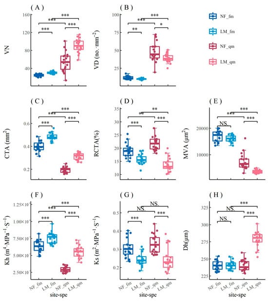 Comparison of mean vessel number (VN, A), vessel density (VD, B), cumulative area of all counted vessels (CTA, C), mean percentage of conductive area within xylem (RCTA, D), mean vessel area per rings (MVA, E), theoretical hydraulic conductivity (Kh, F), theoretical xylem-specific hydraulic conductivity (Ks, G), and overall mean hydraulic diameter (Dh, H) of the xylem of F. mandshurica (fm) and Q. mongolica (qm) between urban (NF) and rural (LM) areas. The significance values of the xylem anatomical characteristics are indicated. NS. no significant difference; * p < 0.05; ** p < 0.01; *** p < 0.001.