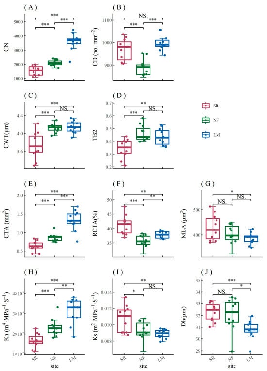 Comparison of cell number (CN, A), cell density (CD, B), cell-wall thickness (CWT, C), cell-wall reinforcement index (TB2, D), cumulative total cell area (CTA, E), mean percentage of conductive area within xylem (RCTA, F), mean lumen area (MLA, G), theoretical hydraulic conductivity (Kh, H), theoretical xylem-specific hydraulic conductivity (Ks, I), and mean hydraulic diameter (Dh, J) of P. sylvestris var. mongolica xylem among urban (SR—heavy pollution, NF—light pollution) and rural (LM) sites. The significance values of the xylem anatomical characteristics are indicated. NS. no significant difference; * p < 0.05; ** p < 0.01; *** p < 0.001.