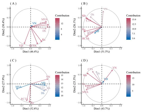 The principal component analysis of the main xylem anatomical parameters of the three species in urban and rural areas showed that (Figure 8 and Figure 9) the first component (PC1) of F. mandshurica in urban areas (46.4%) was mainly composed of Kh, MVA, CTA, and Dh (Figure 8A), while the PC1 in rural areas (51.5%) was mainly composed of Ks, Kh, RCTA, and CTA (Figure 8B). The second component (PC2) of F. mandshurica in urban areas (30.4%) was mainly composed of RCTA, VD, and Ks (Figure 8A), while the PC2 in rural areas (26.1%) was mainly composed of VN (Figure 8B). Compared with urban and rural areas, the main anatomical parameters exchanged in PC1 and PC2, and their contributions, were completely opposite (Figure 8A,B).