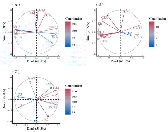 The contribution of each anatomical parameter to PC1 and PC2 of P. sylvestris var. mongolica was similar at both urban pollution levels (Figure 9A,B). The PC1 of P. sylvestris var. mongolica in two urban sites (62.1% and 63.1%) were mainly composed of MLA, Ks, RCTA, Dh, and CWT (Figure 9A,B), while the PC1 in the rural site (56.3%) was mainly composed of MLA, Kh, RCTA, CTA, CD, and TB2 (Figure 9C). The PC2 of P. sylvestris var. mongolica in two sites (30.9% and 20.5%) were mainly composed of CTA and CN (Figure 9A,B), while the PC2 in rural areas (28.9%) was mainly composed of Dh, CWT, and Ks (Figure 9C). Similar to F. mandshurica and Q. mongolica, the contribution of anatomical parameters of the xylem of P. sylvestris var. mongolica to the principal component axis is opposite in urban and rural areas (Figure 9A–C).
