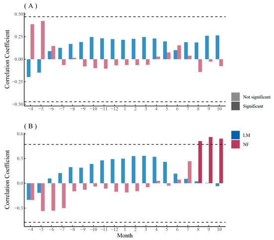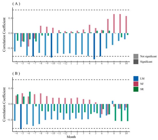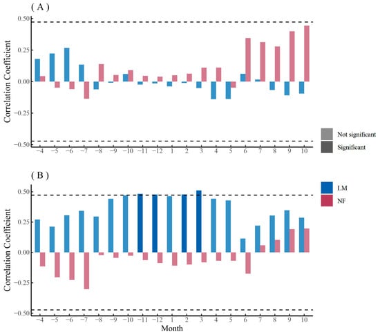 Correlation analysis between the first (A) and second (B) principal components of xylem anatomical parameters and monthly SPEI of Q. mongolica in urban (NF) and rural (LM) areas. The dash line indicates the 0.05 significant level.