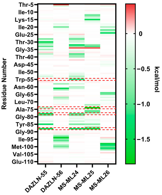| Arg-88 | −1.46 ± 2.51 | Leu-61 | −1.44 ± 1.65 | Thr-31 | −1.35 ± 1.37 | Arg-88 | −1.61 ± 1.84 | Leu-21 | −1.26 ± 0.928 |