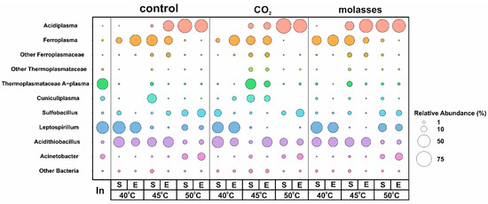 Among the bacteria, the proportion of iron-oxidizing autotrophs of the genus Leptospirillum was the highest at 40 °C. The increase in temperature up to 45 °C led to the elimination of these bacteria from the community, which is consistent with the data on the properties of representatives of this genus, as well as data on changes in microbial populations, which were obtained in our earlier works [34,35,36]. However, it should be noted that an increase in the share of bacteria of the genus Leptospirillum at 50 °C was observed in the experiments with molasses, which is somewhat atypical for this genus, most of the known representatives of which are autotrophs and mesophiles.