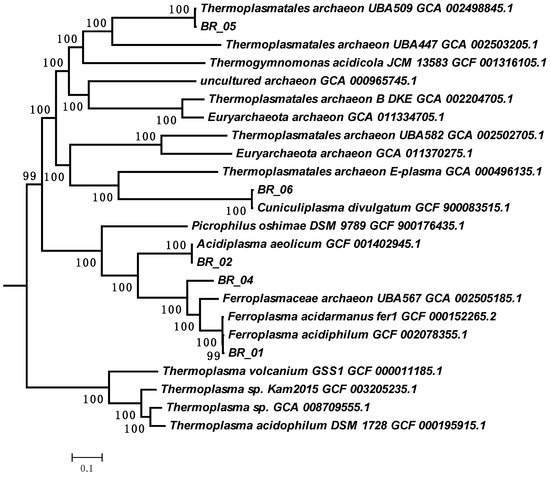Phylogenetic tree of representatives of the family Thermoplasmataceae constructed on the basis of concatenated protein sequences. Numbers indicate bootstrap values. BR indicate bins collected from the metagenome studied in this work.