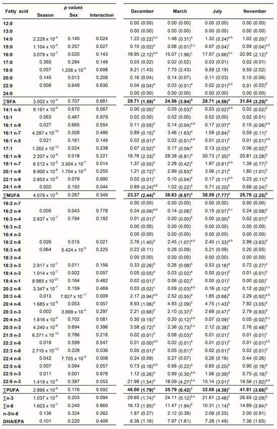 Neither sex differences nor interactions between sex and season were found for the distinct fatty acid classes (Figure 1). By analyzing each fatty acid, several differences between sexes and sex versus seasonal interactions were noticed (Figure 1). In contrast, many differences were detected for all classes and most individual fatty acids by comparing the distinct reproductive stages (Figure 1).