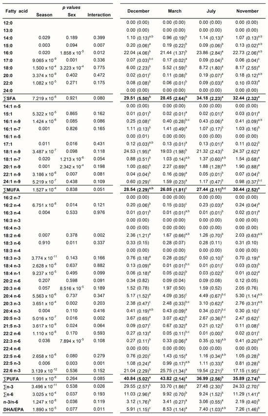 Statistical analyses were carried out using Past4 software 4.12 [24], and graphs were obtained via GraphPad Prism 6 and Microsoft Excel for Microsoft 365 MSO (Version 2310 Build 16.0.16924.20054) 64-bit. The normality and homogeneity of variances were checked using Shapiro–Wilk and Levene tests, respectively. Data transformations were carried out (using ranks) whenever necessary to meet the assumptions. Two-way ANOVA was used to evaluate the influence of sex and reproductive stages (December, March, July and November) on individual fatty acid and fatty acid class (SFA, MUFA, PUFA, n-3 PUFA, n-6 PUFA, n-3/n-6, and docosahexaenoic acid/eicosapentaenoic acid ratio—DHA/EPA) variance. The post hoc Tukey test followed ANOVA. Significant differences were considered when p < 0.05.