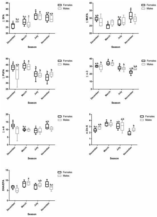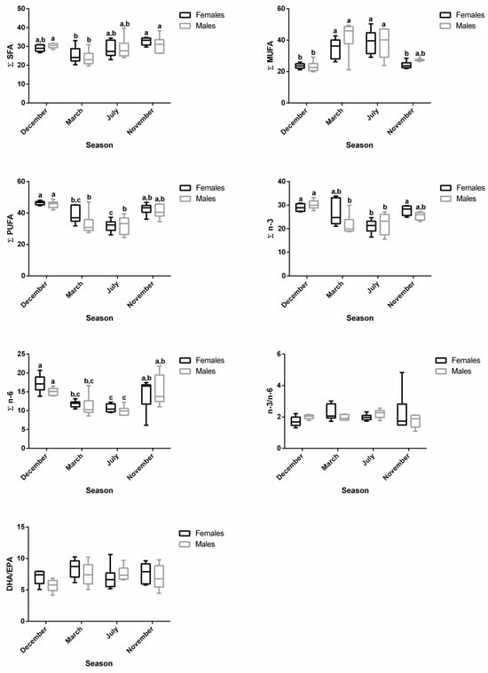 Changes in ∑SFA, ∑MUFA, ∑PUFA, ∑n-3, ∑n-6, n-3/n-6, and DHA/EPA in female and male brown trout liver during four reproductive stages: spawning capable (December), regressing (March), regenerating (July), and developing (November). Data are shown as a median and a minimum-to-maximum range; n = 6 animals/season/sex. Different lower-case letters indicate significant post hoc differences (p < 0.05) between reproductive stages within each sex using the Tukey test. The sum (∑) values correspond to the mean of the ∑ of various animals for each class of fatty acids.