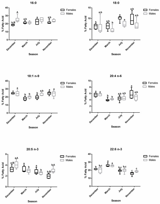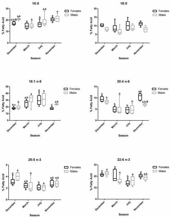 Changes in the percentage of the most representative fatty acids in female and male brown trout liver during four reproductive stages: spawning capable (December), regressing (March), regenerating (July), and developing (November). Data are shown as a median and a minimum-to-maximum range; n = 6 animals/season/sex. Different lower-case letters indicate significant post hoc differences (p < 0.05) between reproductive stages within each sex using the Tukey test. Significant variations between sexes within a reproductive stage are indicated by different upper-case letters (p < 0.05).