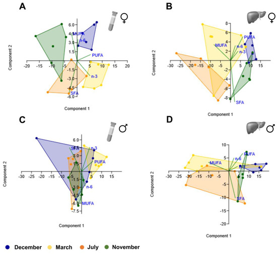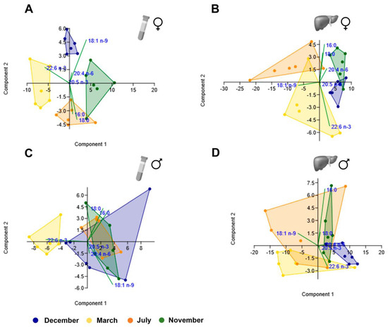 Principal component analysis scatter plot for the representative fatty acids (16:0, 18:0, 18:1 n-9, 20:4 n-6, 20:5 n-3, and 22:6 n-3) in female plasma (A) and liver (B) brown trout samples and male plasma (C) and liver (D) samples.
