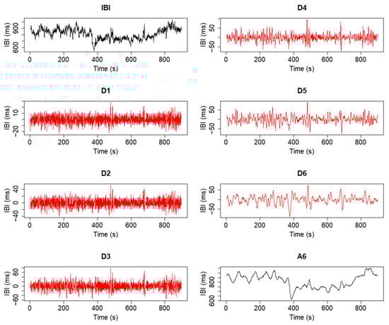 Trend isolation process through a six-level decomposition with the MODWT. The coefficients shown belong to the original signal and its smoothed representation through approximation coefficients (black), as well as to each decomposition level from D1 to D6, which hold the detail coefficients obtained from the analysis (red).