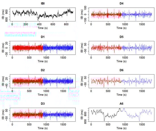 Once a time window has been chosen, the windowed signals are then preprocessed by the R package, which results in detrended segments of the original signals through the MODWT algorithm, adjusted through a border handling strategy (Figure 2) by default. The detrending process is necessary for two main reasons: first, the detrending method has been designed to mitigate the effects of the very-low-frequency (VLF) band [,], as shown in Figure 4; second, the detrending allows one to make the data stationary, which is a necessary step in order to further analyze the data [,]. As with the smoothness priors detrending method, for which a frequency cutoff can be selected to better perform the detrending [,], the nature of the MODWT allows one to define a frequency cutoff, or a reference frequency from which the cutoff can be computed, that will determine which frequency bands will be contained in the estimated trend [].