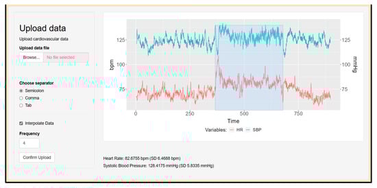 CardioRVAR’s graphical interface allows one to upload data from csv and txt files, which contain information regarding beat-to-beat BP and IBIs. During the program testing, these csv files were obtained from the ACQKnowledge v4.2.0 software. The application also offers the possibility to interpolate each recording, if not done yet, to a sample frequency of 4 Hz by default, as suggested in the literature [,]. After uploading the data, a visual representation of the HR tachogram associated with the SBP data will be displayed on-screen. The user will now have the possibility to select a time window to isolate a specific interval from the recording for its analysis. Mean HR and SBP values of the isolated segments will be reported once the window is selected. Figure 3 depicts this interface and this process.