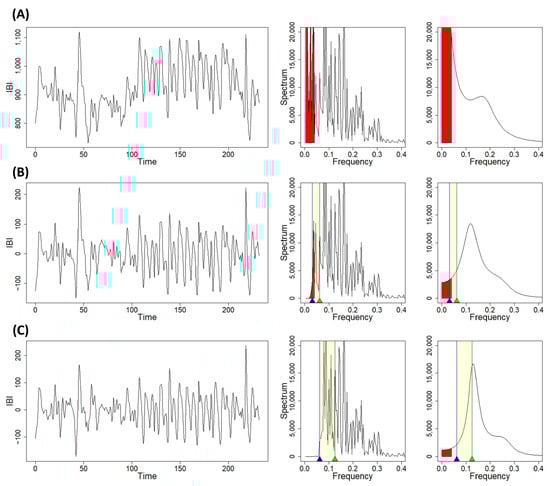 Time-domain and frequency-domain changes in HRV due to the preprocessing algorithms available in CardioRVAR. (A) Non-detrended signal, with a sample frequency of 4 Hz, and its frequency-domain non-parametric and parametric spectra, with a significant very-low-frequency component. (B) Detrended signal after selecting a reference frequency of 0.04 Hz (cutoff: 0.03125 Hz, blue mark), accompanied by its non-parametric and parametric spectra, showing a mitigated very-low-frequency component. (C) Detrended signal after selecting a reference frequency of 0.07 Hz (cutoff: 0.0625 Hz, blue mark), with spectral densities showing a more mitigated very-low-frequency component, while also affecting part of the LF component. Yellow areas indicate ranges of possible reference frequencies associated with the last decomposition level, used to identify the cutoff frequency (blue marks) in each case. Green marks indicate cutoff frequencies (0.0625 Hz, 0.125 Hz) associated with the previous decomposition level. Red areas indicate frequency components below 0.04 Hz.