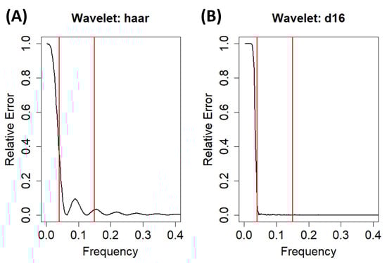 Moreover, the use of a specific wavelet to perform the detrending is important as, apart from mitigating the VLF components, it is desirable to preserve the HF and LF components as much as possible. An example of the importance of this choice is shown in Figure 5, where the relative errors between the non-parametric spectra of a raw IBI signal and its detrended version using the MODWT-based algorithm included in CardioRVAR are depicted. Two different wavelets were used to perform the detrending, the Haar and the Daubechies 8 [] wavelets, which are commonly renamed in R packages such as RHRV as haar and d16, respectively []. While both wavelets generate high relative errors below 0.04 Hz, indicating that the VLF component has been mitigated, the Daubechies 8 wavelet tends to maintain lower relative errors for the HF and LF components than the Haar wavelet. This indicates that the former is better for preserving these HF and LF components and therefore is more suitable for the detrending process. CardioRVAR allows the use of several wavelets to modify the detrending and operates with the Daubechies 8 wavelet by default.