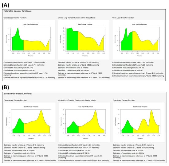 Transfer functions reported by the software from patient during (A) head-up tilt and (B) post-tilt recovery. From left to right: closed-loop transfer function without zero-lagged interactions, closed-loop transfer function with zero-lagged interactions, and open-loop transfer function. Color code: LF band (green), HF band (yellow).