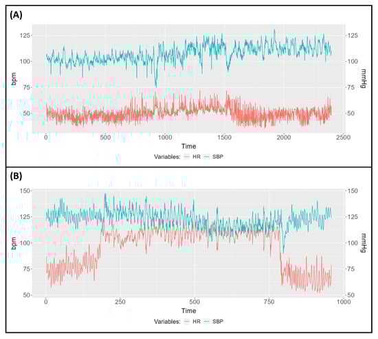 There are several procedures to estimate HRV and BPV. The procedure of interest in this work is the frequency-domain assessment method, which consists of the identification and isolation of the activity present in two frequency bands associated with adrenergic and vagal modulation: respectively, the low-frequency (LF) band, consisting of frequencies from 0.04 to 0.15 Hz, and the high-frequency (HF) band, which encompasses frequencies from 0.15 to 0.4 Hz [,]. These components are extracted from HR and blood pressure (BP) recordings, such as systolic or diastolic blood pressure (SBP, DBP). One should note that, in BPV, this HF band would be representative of the respiratory activity, whose frequency components are usually located at this band [,].