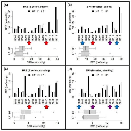 Individual closed-loop BRS estimates computed through CardioRVARapp from the EUROBAVAR B series of subjects, and their distributions, obtained in (A) supine position, through the maximum coherence strategy; (B) supine position, through the coherence-thresholding strategy; (C) standing position, through the maximum coherence strategy; and (D) standing position, through the coherence-thresholding strategy. Red arrows indicate baroreflex-impaired subjects. Blue arrows indicate non-impaired subjects with missing estimates due to the coherence-thresholding strategy. Purple arrows indicate baroreflex-impaired subjects with missing estimates due to the coherence-thresholding strategy. Color code: HF band (black), LF band (white).