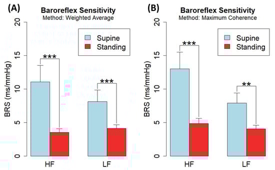Baroreflex sensitivity changes in closed-loop estimates computed by CardioRVARapp from EUROBAVAR during supine and standing positions in HF and LF bands, excluding the two impaired ones (n = 19), through (A) Gaussian-weighting strategy and (B) maximum coherence strategy. Significance: p < 0.01 (**), p < 0.001 (***).