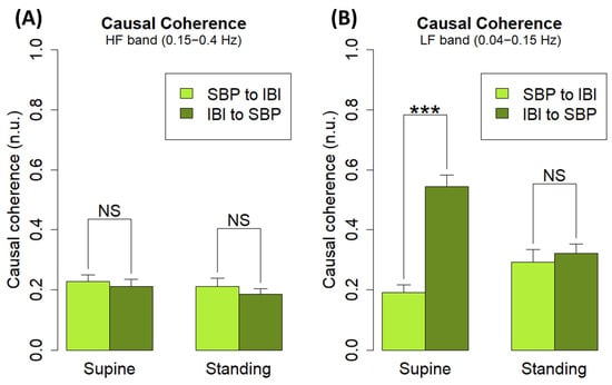 An analysis of causal coherence (Figure 12, Table 4) in both positions was performed on the same subjects, which revealed, as briefly reported in the Spanish Society of Physiological Sciences meeting [], that the IBI-to-SBP coherence was significantly higher than the SBP-to-IBI one for the LF band in the supine position (p < 0.001), whereas, in the standing position, both coherence flows were statistically equally predominant. For the HF band, no significant changes in causal coherence were observed. The changes observed in the causal coherence in the LF band are important in the context of BRS, as they follow a similar pattern as reported in the literature, which is indicative of baroreflex mechanisms taking place in the analyzed system [].