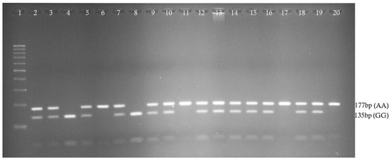 Agarose gel electrophoresis confirmed rs352140 SNP. Lane 1 indicates 100 bp ladder. Lanes 4 and 8 indicate GG (135/42 bp) genotypes. Lanes 2, 3, 5, 7, 8, 9, 12–16, and 18–19 indicate GA (177/135/42 bp) genotypes. Lanes 6, 11, 17, and 20 indicate AA (177 bp) genotypes.
