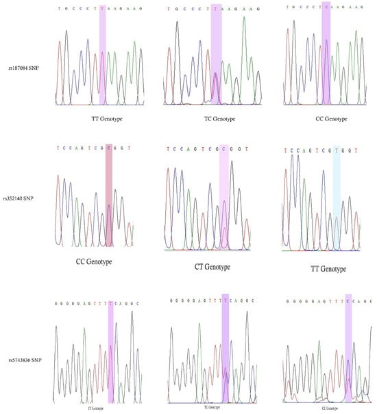 Sanger sequencing analysis revealed probable genotypes for rs187084 and rs5743836 SNPs, and PCR–RFLP analysis revealed rs352140 SNP genotypes.