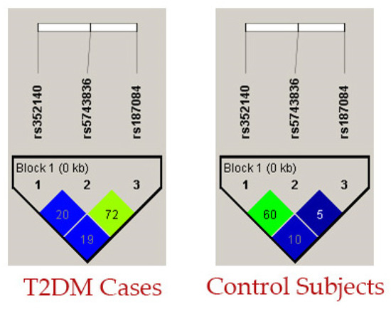 Linkage disequilibrium analysis (LD), defined by the delta coefficient (D), of the three SNPs (i.e., rs352140, rs187084, and rs5743836 in the TLR9 gene) was determined for both T2DM and control groups. No linkage disequilibrium was observed between the three SNPs, as shown in Table 9 and Figure 3. Due to the limited sample size, we could not identify the genetic marker that tags the actual causal variants in developing T2DM in the Saudi population.