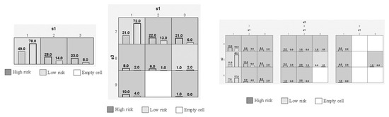 Gene–gene interaction was studied in 100 T2DM cases, and it was carried out in the SNPs (rs187084, rs352140 & rs5743836) in the TLR9 gene (Table 10). The presentation of R1, R2, and R3 confirms a strong association between rs187084, rs352140, and rs5743836 (p < 0.001), with the combination of testing accuracy among S1 (T = 0.645), S1/S3 (T = 0.7), and S1/S2/S3 (T = 0.705). In addition, the MDR analysis (Figure 4) ensures the graphical representation model in women through S1–S3, as well as the findings from the study, which confirmed a graphical representation of the integrated effect of the complete loci models as high- and low-risk categories and statistical interactions. The dendrogram imposed the best feasible combination of synergistic/redundant SNP interaction. Among the three SNPs, S1 and S3 in the TLR9 gene belonged to one cluster with substantial synergy and independent effect. A synergistic relationship was also identified between the S2 and S1 combinations. This supports the view that T2DM is inherited in a multifactorial manner, with major/minor gene(s) involvement, in addition to environmental factors.