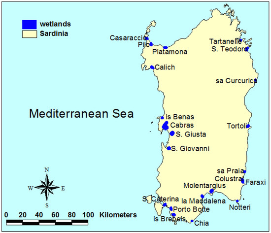 Study area (Sardinia, Italy). The total surface area of the 22 wetlands under study is 5545 ha, and the average inter-distance is 12.6 km. With the exception of Tartanelle and Tortoli, all wetlands belong to the Natura 2000 network.