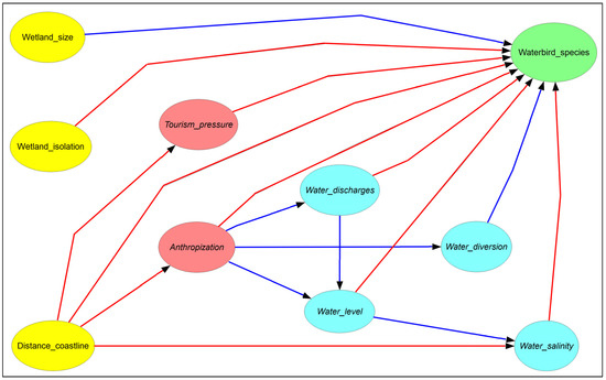 The conceptual model (expert knowledge) of the level of avian diversity (green ellipse) in the Sardinian wetlands as a function of spatial (yellow ellipses), anthropic (red ellipses), and hydrological (blue ellipses) variables. Arrows denote the hypothesized direct influences of the source variables upon the destination variables. Blue and red arrows indicate positive and negative effects, respectively.